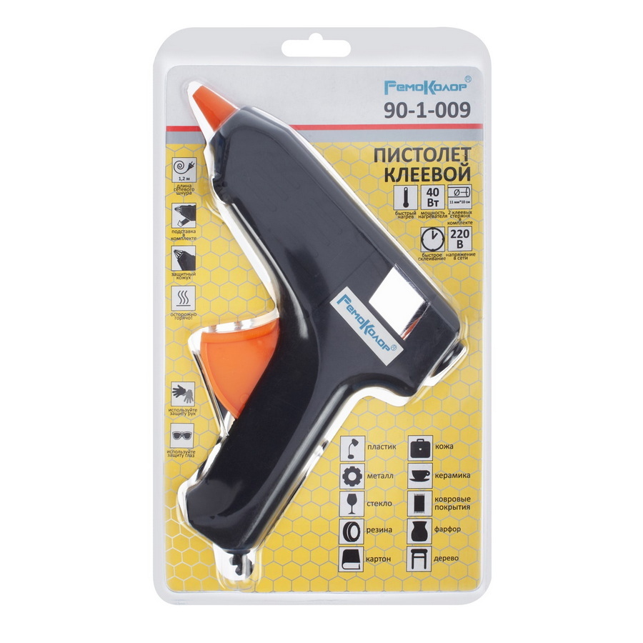 Мощность нагревателя 40 Вт. Длина сетевого кабеля 1,2 м. Быстрый нагрев и склеивание. Пистолет имеет защитный кожух и стальную складную подставку. Клеевые стержни в комплекте.