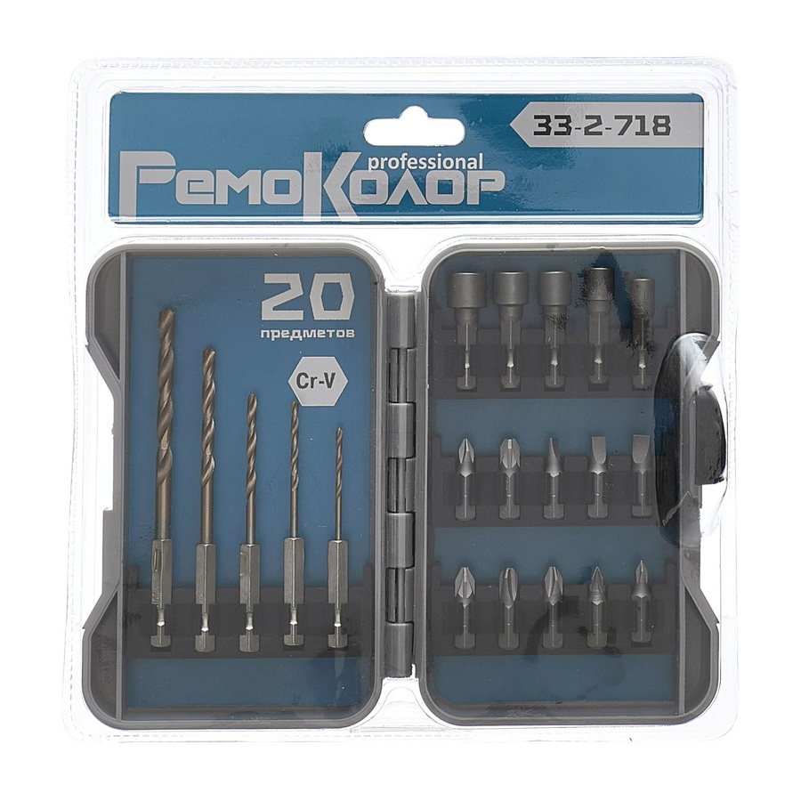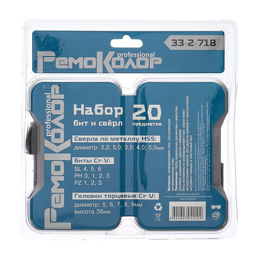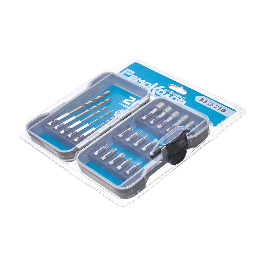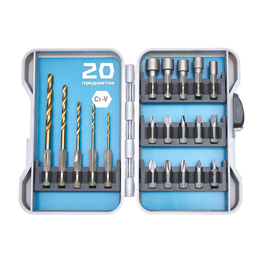 Материал: сверла - быстрорежущая сталь HSS с покрытием из нитрида титана, биты и головки - хромванадиевая сталь.