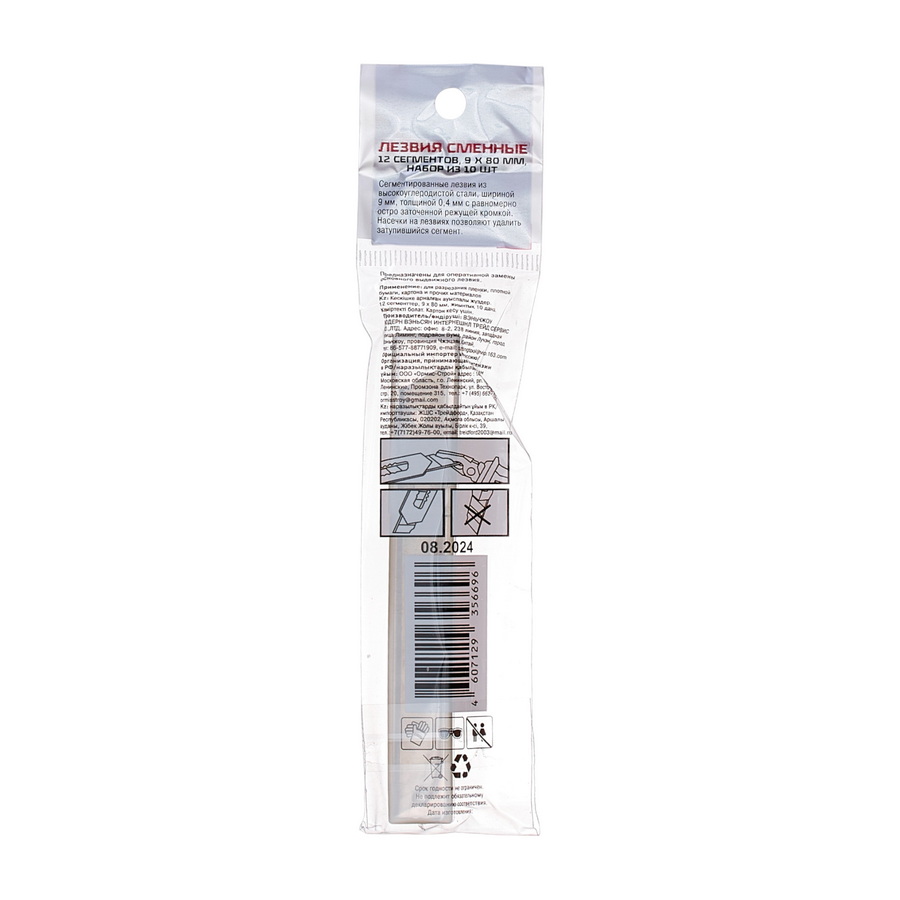 Материал: сегментированные (12 сегментов) лезвия 9 х 80 мм, толщина 0,4 мм из высокоуглеродистой стали с равномерно заточенной режущей кромкой. Набор из 10 шт. Упаковка пластиковый бокс.