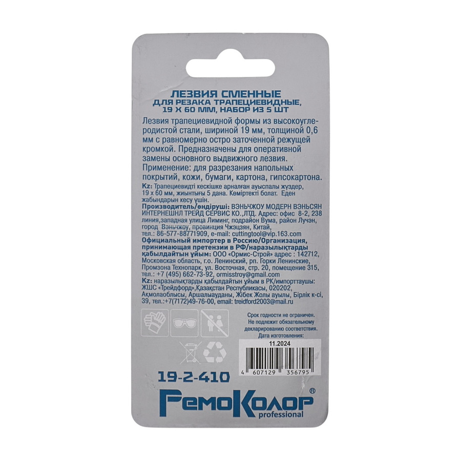 Материал: трапециевидные лезвия 19х60мм, толщина 0,6мм из высокоуглеродистой стали с равномерно заточенной режущей кромкой. Набор из 5 шт. Упаковка пластиковый бокс.