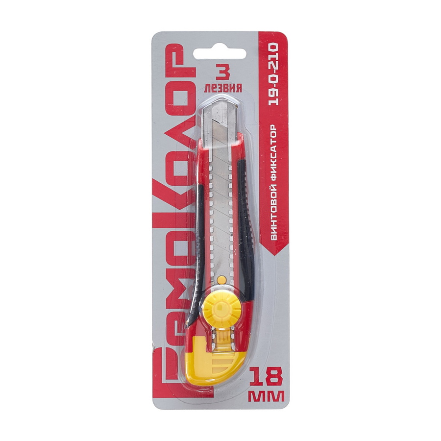 Материал корпуса ABS-пластик со вставками из термопластичной резины, сегментированное лезвие 18 х 100 мм, толщина 0,5 мм из высокоуглеродистой стали, 3 шт. в комплекте. Упаковка блистер.