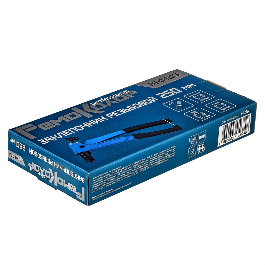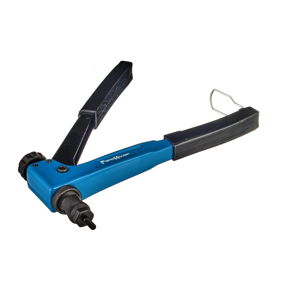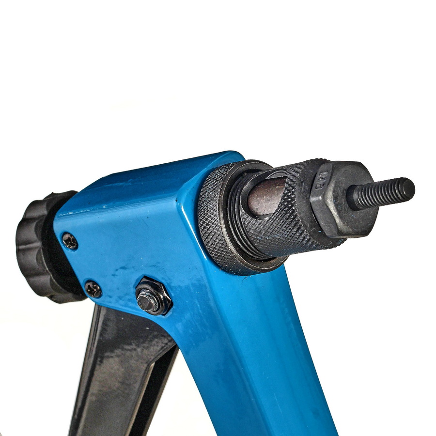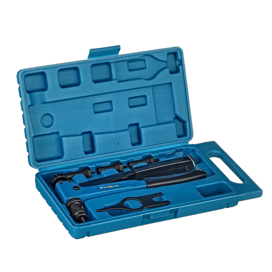 Комплектация: заклепочник, 4 сменные насадки под резьбу M3, M4, M5, M6 ключ для смены насадок, пластиковый кейс.