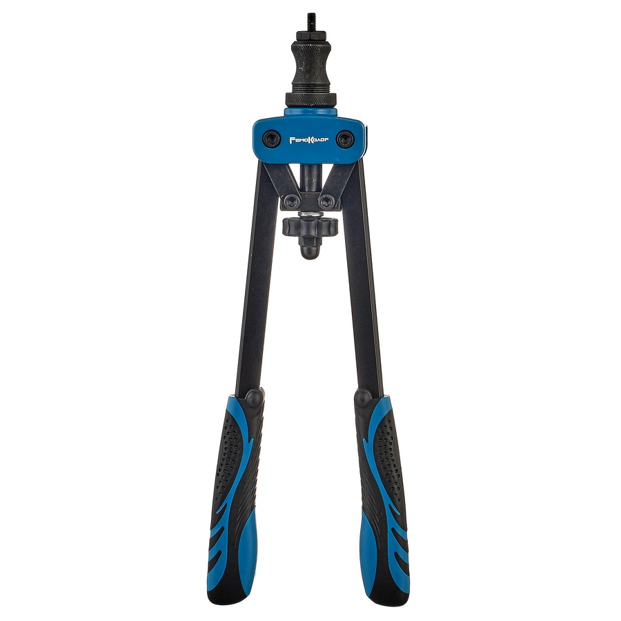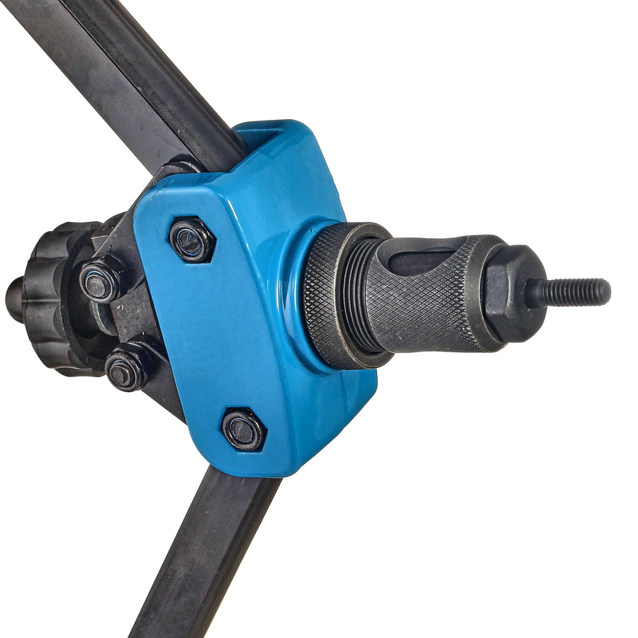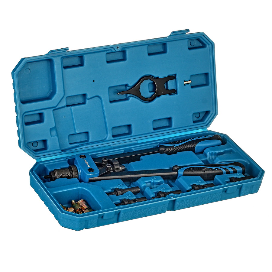 Комплектация: заклепочник, сменные насадки под резьбу M3, M4, M5, M6, M8, M10, ключ для смены насадок, пластиковый кейс с набором резьбовых заклепок.
