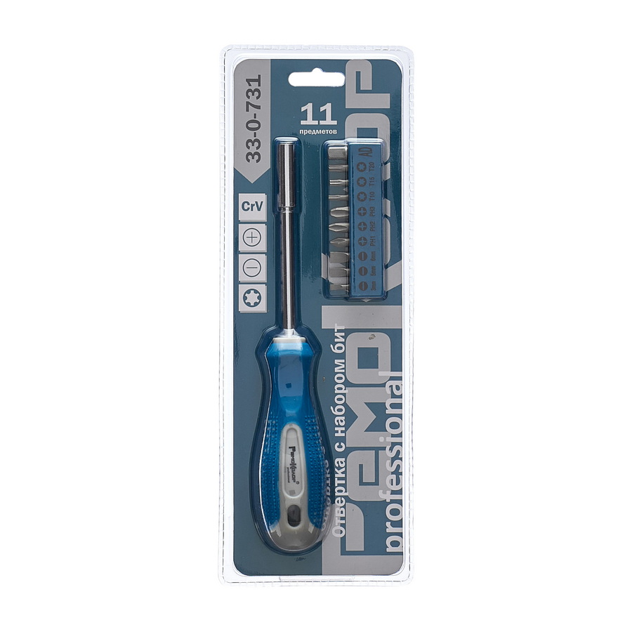 Материал: Стержень, адаптер бит, биты - хромванадиевая сталь, двухкомпонентная рукоятка – пластик со вставками из термопластичной резины.