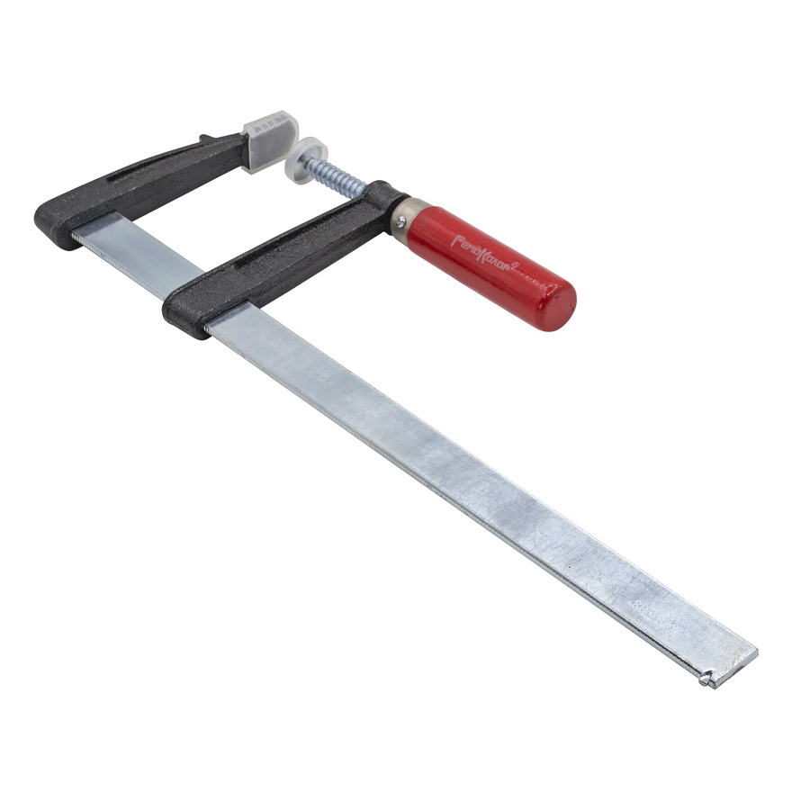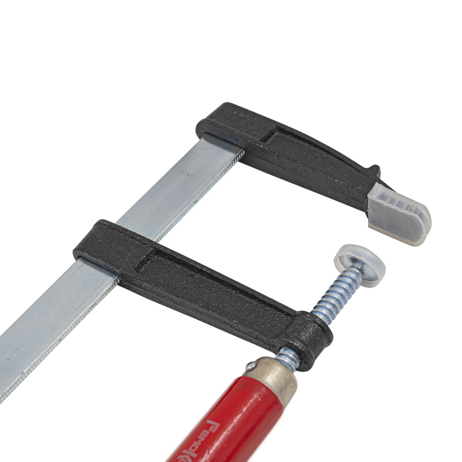 Применение: F-образная струбцина используется при столярных работах, позволяет фиксировать заготовки из металла, древесины и других материалов. Деталь помещают между губками, одна из которых подвижна и служит для регулировки величины захвата. Винтовой зажим позволяет прикладывать значительное усилие для надежной фиксации. Защитные накладки предотвращают повреждение детали. Элементы конструкции выдерживают высокую температуру, поэтому струбцина подходит для проведения сварочных работ, при этом пластиковые накладки необходимо снять. Глубина захвата 80мм. Ширина раскрытия губок 300мм.