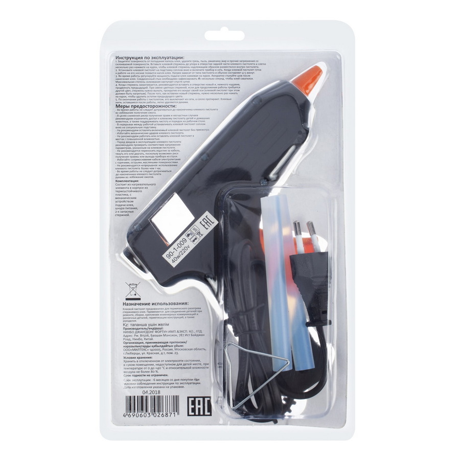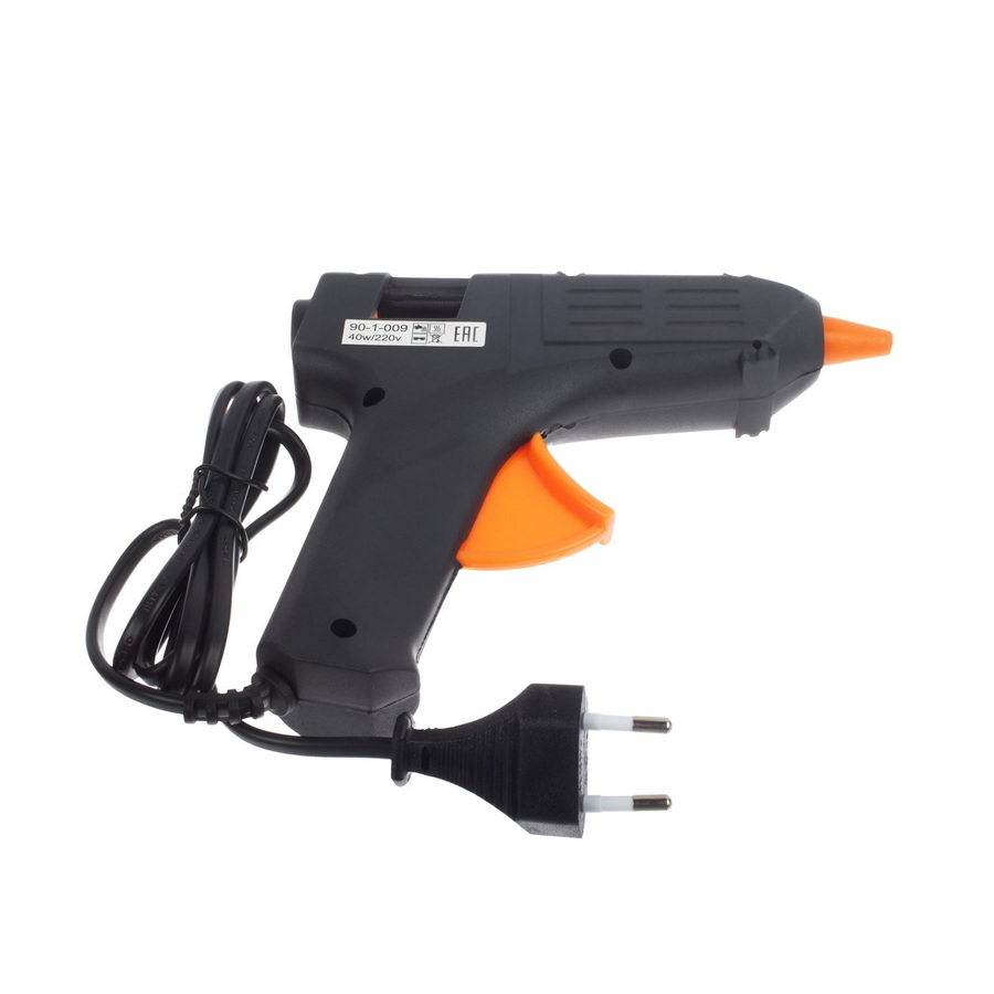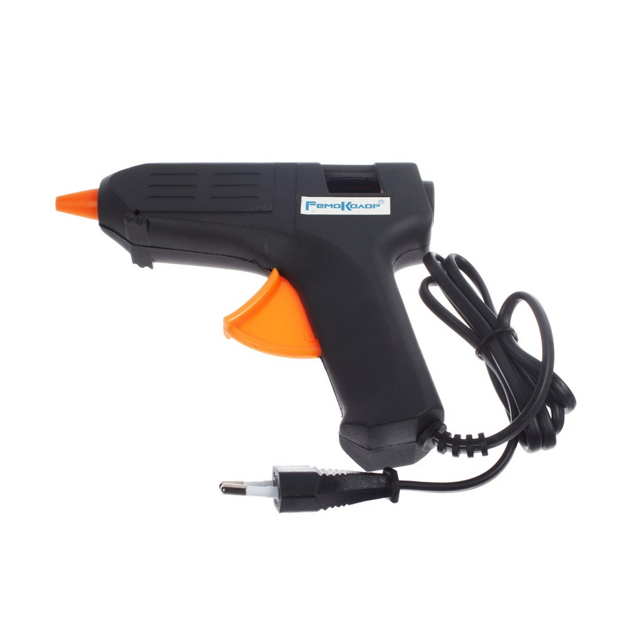 Мощность нагревателя 40 Вт. Длина сетевого кабеля 1,2 м. Быстрый нагрев и склеивание. Пистолет имеет защитный кожух и стальную складную подставку. Клеевые стержни в комплекте.