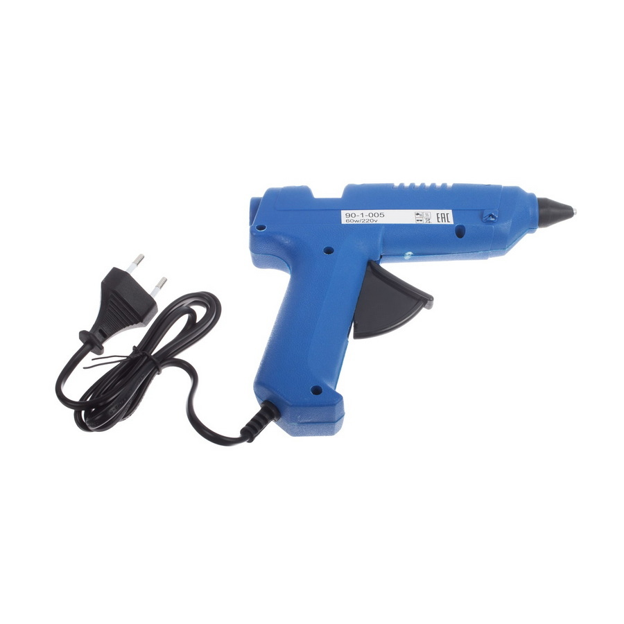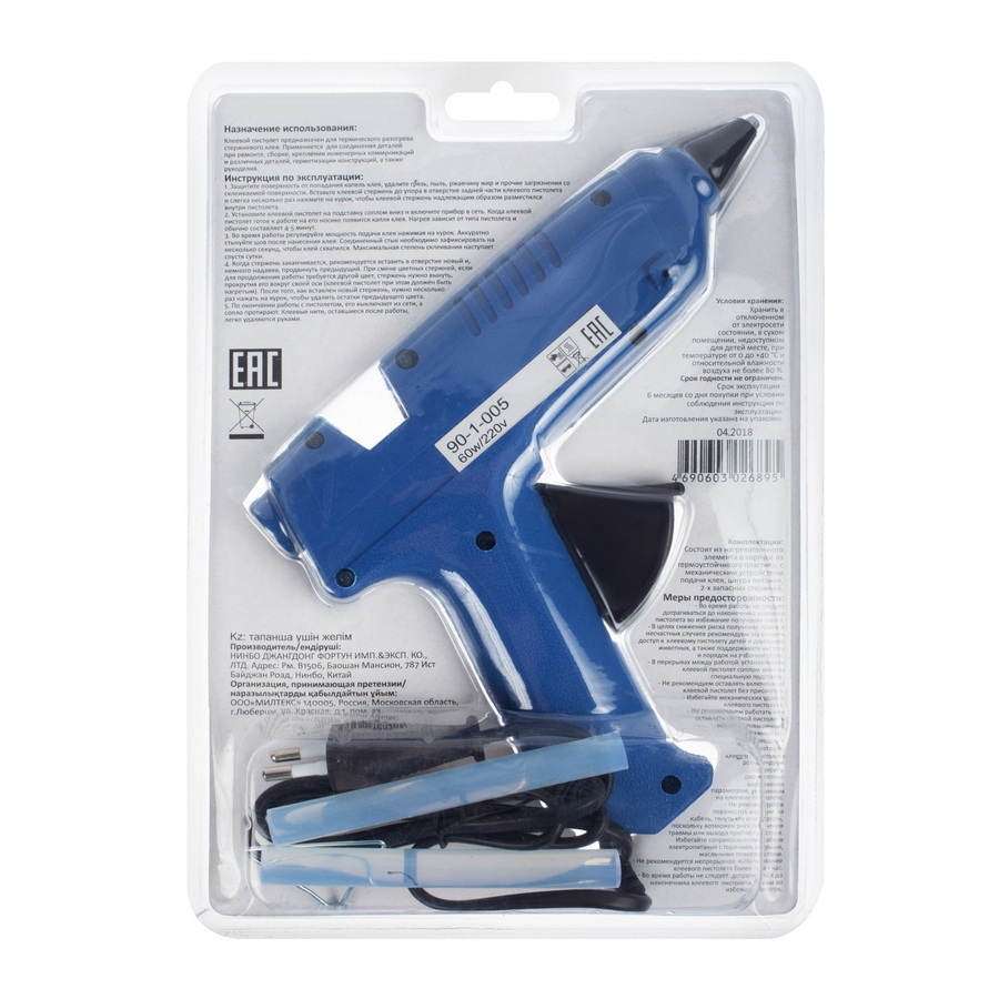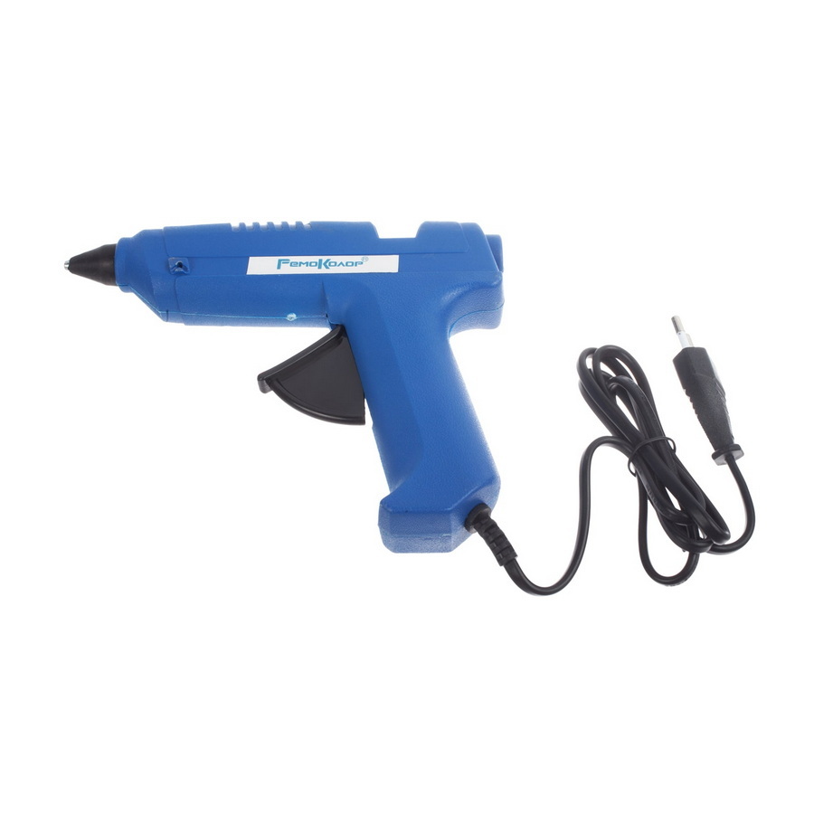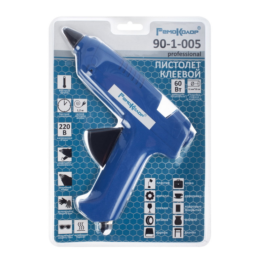 Мощность нагревателя 60 Вт. Длина сетевого кабеля 1,2 м. Быстрый нагрев и склеивание. Пистолет имеет защитный кожух и пластиковую складную подставку. Клеевые стержни в комплекте.