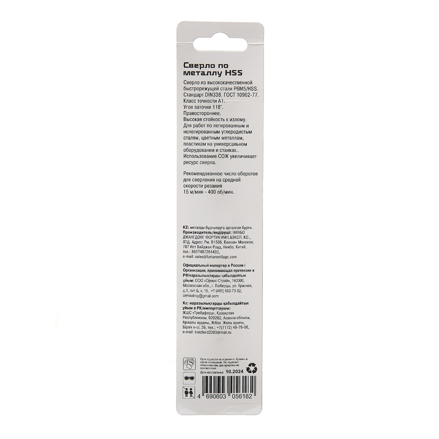 Изготовлено из высококачественной быстрорежущей стали Р6М5/HSS, класс точности A1, правостороннее. Твердость режущих кромок 62–65 HRc. Хвостовик цилиндрический - 13 мм, под патрон. Коническая заточка, угол заточки 118о. Рекомендуется использовать СОЖ.