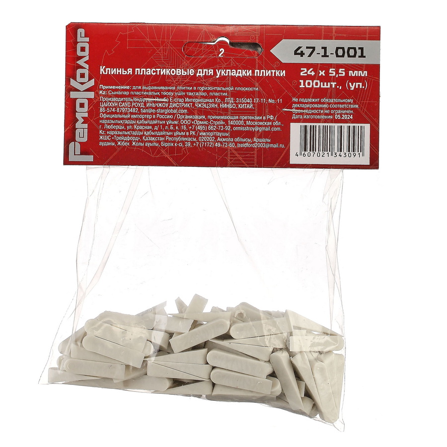 Предназначены для выравнивания керамической плитки относительно поверхности и обеспечения одинаковой ширины межплиточных швов. Их использование особенно эффективно при неровных стенах и больших перепадах в укладочных швах. Размер клиньев выбирается в зависимости от типа отделочных работ, от тяжести и габаритов плиточных материалов. После полного высыхания раствора клинья вынимают, а швы замазывают специальной затиркой.