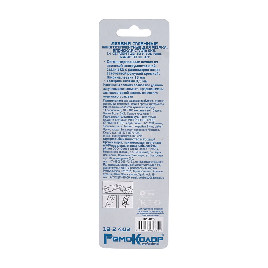 Материал: многосегментные (14 сегментов) лезвия 18 х 100 мм, толщина 0,5 мм из японской углеродистой стали SK5 с равномерно заточенной режущей кромкой. Набор из 10 шт. Упаковка пластиковый бокс.