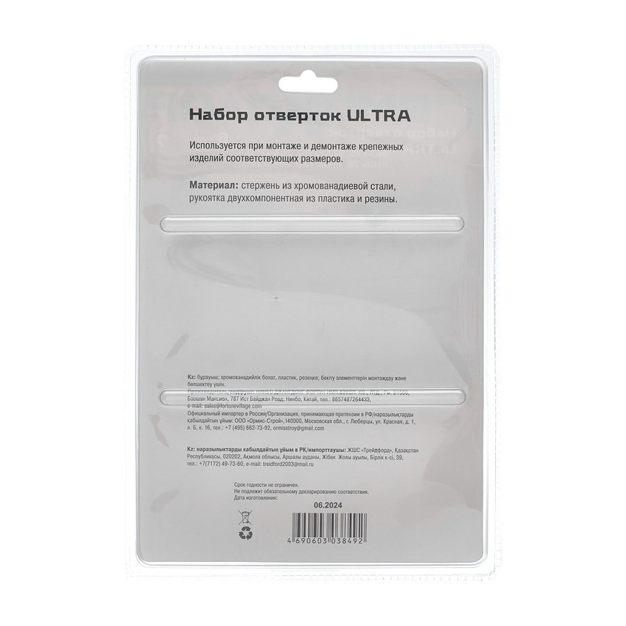 Материал: Стержень - хромванадиевая сталь, двухкомпонентная рукоятка – пластик со вставками из термопластичной резины.