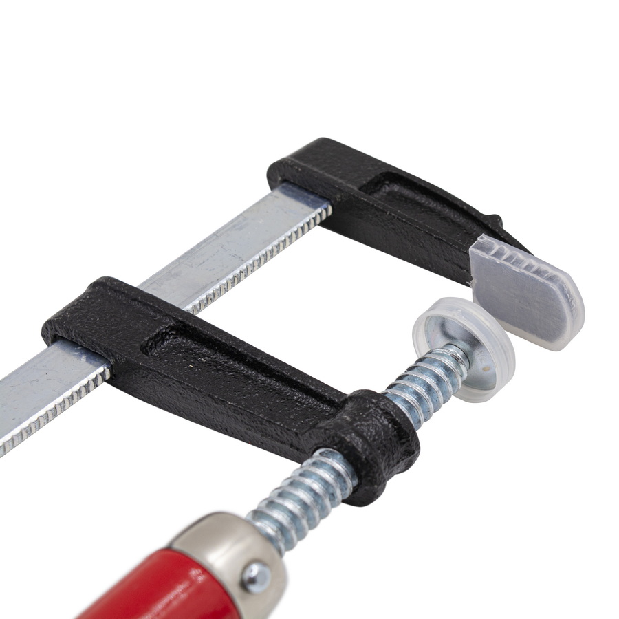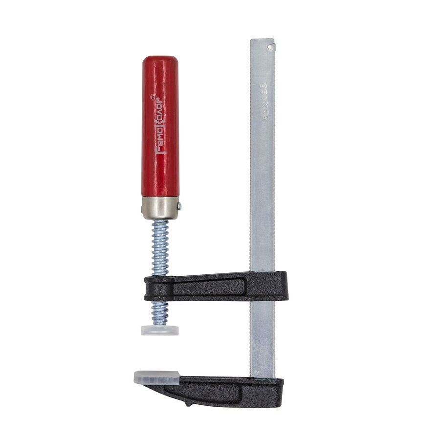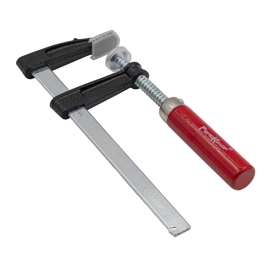 Применение: F-образная струбцина используется при столярных работах, позволяет фиксировать заготовки из металла, древесины и других материалов. Деталь помещают между губками, одна из которых подвижна и служит для регулировки величины захвата. Винтовой зажим позволяет прикладывать значительное усилие для надежной фиксации. Защитные накладки предотвращают повреждение детали. Элементы конструкции выдерживают высокую температуру, поэтому струбцина подходит для проведения сварочных работ, при этом пластиковые накладки необходимо снять. Глубина захвата 50мм. Ширина раскрытия губок 150мм.