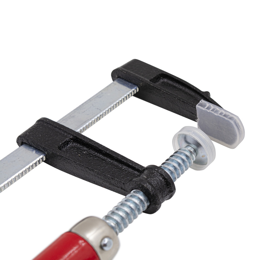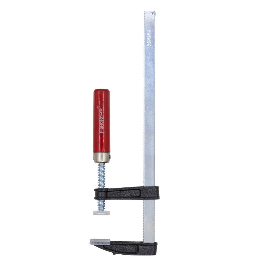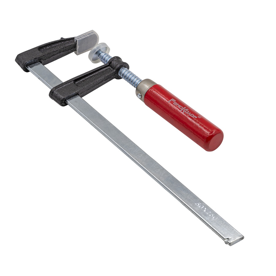 Применение: F-образная струбцина используется при столярных работах, позволяет фиксировать заготовки из металла, древесины и других материалов. Деталь помещают между губками, одна из которых подвижна и служит для регулировки величины захвата. Винтовой зажим позволяет прикладывать значительное усилие для надежной фиксации. Защитные накладки предотвращают повреждение детали. Элементы конструкции выдерживают высокую температуру, поэтому струбцина подходит для проведения сварочных работ, при этом пластиковые накладки необходимо снять. Глубина захвата 50мм. Ширина раскрытия губок 250мм.
